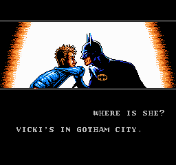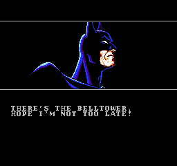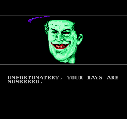 Interestingly, when the game was first revealed in Nintendo Power, it presented completely different cutscenes, closer to the style of the comic book than the digitized stills seen in the final version. This prototype ROM was leaked to the public and is available for download. All of the cutscenes are completely different, with new dialogue. The game doesn’t even end with a proper confrontation against the Joker, instead you fight the Firebird boss, then are treated to a cutscene where Batman walks into the Joker’s office and socks him in the jaw. Some of these looks pretty cool, particularly the animation, but the artist’s rendering seems like a poor trace of Jack Nicholson’s likeness, making it look more comical than it probably should. The ending contains music not found in the final version. Additionally, there are 1up power-ups to be found, which were removed before released.