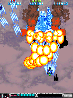 Batsugun‘s storyline involves an alien force attacking earth. An elite mercenary group called The Skull Hornets is sent in, who have special ships that can both fly underwater and into the stratosphere. There are six main characters in total, although there are only technically three different variations, with two types of each to accommodate for two simultaneous players. Ship A is called the Sky Mirage, Ship B is the Dragon’s Whisper, and Ship C is the Judgment Flasher. Each is focused on range, power, or a mix of both. All are equipped with the usual assortment of single-use bombs too.