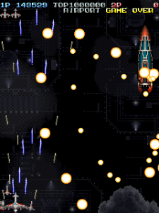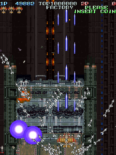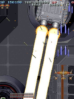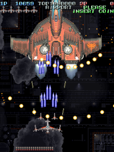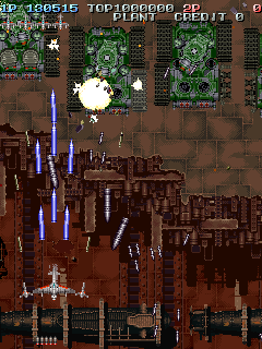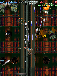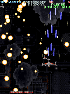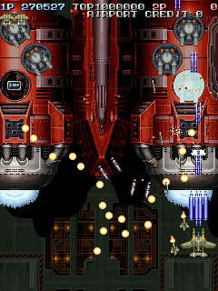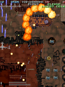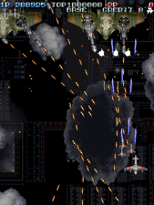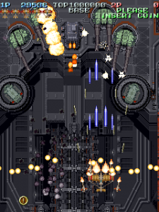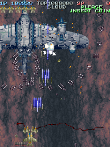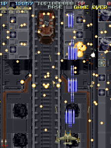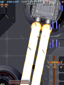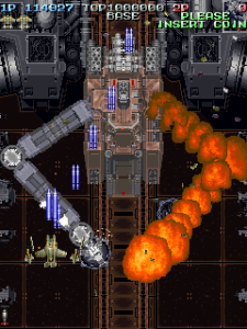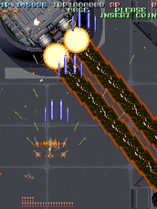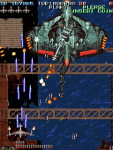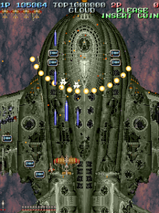 Even though it’s a visual treat, the art style does intrude a bit on the action. The pacing and amount of bullets have shot up, and while it’s not quite a bullet hell shooter, it’s considerably more hectic than Raizing’s other earlier games. In shooters of this type, the bullets are brightly colored and easy to see, so they stand out from the scenery. Not so in Battle Garegga, where the bullets look like actual bullets. These projectiles are long, dark silver or gray colored, and tend to blend in with the dark machinery in both the foreground and background. Many fans quite were quite vocal in their criticism, and so Raizing eventually made a second version that replaces many of the realistic looking bullets with bright yellow fireballs.