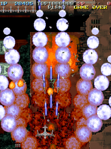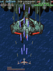Battle Garegga is a game with a divisive reputation. A number of shoot-em-up fans regard it as one of the best shooters of all time; others feel that the cluttered visual style and rank system ruin some pretty cool ideas. Nevertheless, it became one of the most well-known games in Raizing’s output. The game was directed by Kazuyuki Nakashima, one of the ex-Compile staff members who left to help form Raizing and programmed Shinobu Yagawa, who previously worked on the manic Famicom shooter Recca and later directed many other subsequent shooters for Raizing and Cave, using the style of Battle Garegga as its base. The general style, in addition to the bomb collection system, was heavily influenced by Taito’s 1990 shooter Gun Frontier, to the point where Battle Garegga could be considered a spiritual successor.