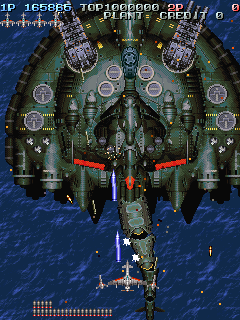 Visually, Battle Garegga is incredibly outstanding, with a depth in pixel artwork comparable to Irem/Nazca games like Metal Slug or In the Hunt. It’s got some spectacular looking explosions, as each enemy goes down in different blazes of glory – some are simple, small balls of fire, others are huge, twisting fireworks. Bits of shraprnel and debris fly off of every hit. The atmosphere might be dark and depressing, but the attention to detail is quite impressive, especially on the gigantic fighter plane bosses. The most impressive of these is a gigantic green battleship which resembles a manta ray, complete with a swaying tale. Not the most practical of designs, but it sure looks awesome.