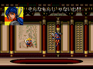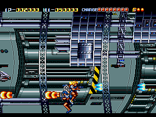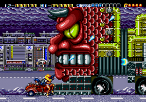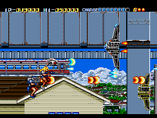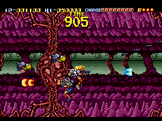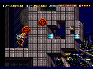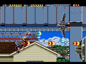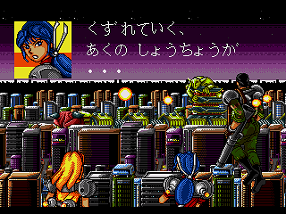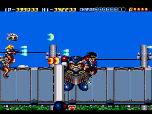 Not only does Daiginjou offer superior music, graphics, and controls, it also has nine levels compared to Trouble Shooter‘s six! Impressively, like in Trouble Shooter each level has a completely unique look along with some unique enemies. Highlights include a long battle against a huge demonic train and a factory level with a cool twisting background that concludes in a boss battle that wouldn’t be out of place in Gunstar Heroes or Contra: Hard Corps. In keeping with tradition, there’s also a knock against Nintendo (though this time more subtle) with the inclusion of yellow-caped enemies that look an awful lot like Mario in Super Mario World.