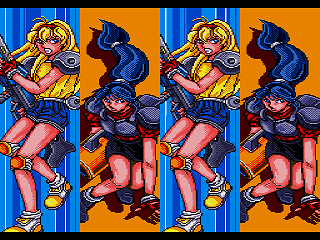 The controls are the same as the first game but with some welcome additions that can be set before starting the game. The first is for that drone that follows Mania and Maria around. Rather than just keeping pace with them it can instead be set to revolve around them regularly or to even fly in the opposite direction of wherever they’re moving. Even cooler though are the two new options for controlling Mania herself. Now the player can choose to have both her and Maria always flip to face the same direction, letting them do the maximum damage possible a target no matter which side of the screen it’s on. Most ambitious, however, is the option to let Mania fire in any of eight directions and shoot in that direction continuously by holding down the fire button.