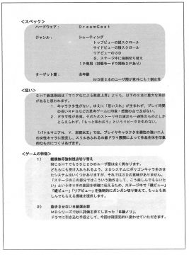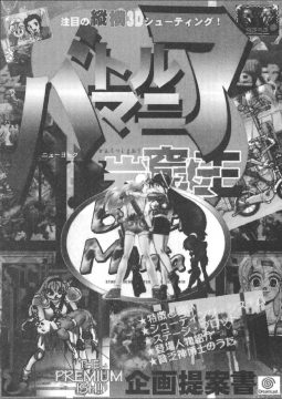 Technically Daiginjou is the final Battlemania / Trouble Shooter game, but there were plans for a third game, titled Battlemania NY: Gankutsujou. The title is a plan on Gankutsuou, the Japanese title of The Count of Monte Cristo, but replacing the word for “king” (“ou”) with “queen” (“jou”). Some documentation reveals this was initially conceived for the PlayStation and Saturn, and eventually a design document was created pitching the game for the Dreamcast. Rendered completely in 3D, includes eight stages, and switches between three different perspectives: side-view (like the Genesis games), overhead, and behind-the-back (like Space Harrier). This document is from Nazo no Game Makyou 4 and includes a full interview with the director, Takayan.