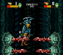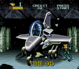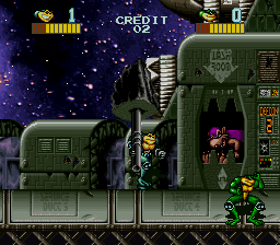 There’s also a number of different weapons that can be picked up and used for a short time, such as exploding crates, laser pistols, and huge chunks of debris. You can also throw many of the enemies, which comes in handy quite often. Essentially, it’s Battletoads finally realized as a traditional beat-em-up without all the gimmicky platforming and vehicle stages of the console versions. There are slight variations in the levels, but nothing too drastic: stage two is single-plane and stage four is vertical like the old Wookie Hole. Only the final stage mixes up the formula, as it’s a Contra-esque shooting stage where you ride on a spaceship and have to fend off attacks from all directions. But in general, survival is no longer based on perfect timing or tight reflexes, but controlling crowds of enemies and getting a feel for invulnerability frames.
