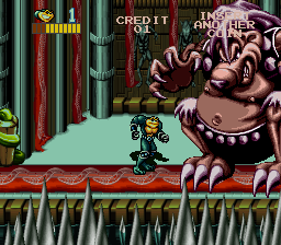 In a lot of ways, this seems like the Battletoads game Rare had always wanted to make; what Battlemaniacsmight have been had Nintendo been a bit more lenient in their censorship policies. Most of the basic sprite-work and game engine are based on that title, but taken to the next level. All three Toads are selectable, each with his own unique animations and slightly different speed and strength despite sharing the same basic attack patterns. You’ve got your standing attack, a dashing attack, and a jumping attack, plus a move that only activates when enemies approach from both sides and special “Super Smash Attacks” in some stages that can clear the screen but can only be used a few times.