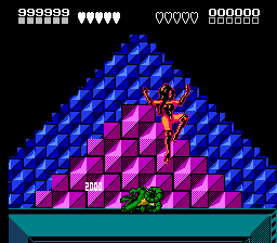 In an interesting turn of events, the game’s difficulty was actually noticeably watered down for the Famicom release. All of the vehicle levels have been slowed down and altered, with the Turbo Tunnel receiving the most cuts in the obstacle department. Numerous other enemies and obstacles have been removed from key moments in the game’s later levels, making previously frustrating sections such as the cog chases in the Terra Tubes a total breeze. Karnath’s Lair is also severely nerfed: most of the snake patterns are simplified, several spikes are moved or removed, and there are no fast snakes. Additionally, the player starts with five lives instead of three (without having to enter the NES cheat code), most enemies and bosses have roughly half the usual hit points, and the Gargantua level is bug-fixed so it can actually be completed in 2-player mode (the 2-player option is also clearly indicated on the title screen). The pause music is also removed for this version. For those who find the original version too daunting, this version is much more accessible.