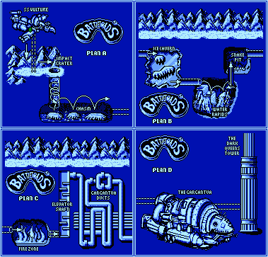 Arc System Works also later produced a Game Gear version of Battletoads which is the polar opposite of its Genesis counterpart. Its redrawn graphics seem nice (many are similar to those of the Genesis version), but don’t let the screenshots fool you: its retooled stages and controls make it a caricature of its 16-bit older brother. The stages approximate the originals, but are much shorter and simpler and feature some significant changes, like making the barriers in the Turbo Tunnel non-lethal and adding brand new obstacle and enemy layouts. While some of those changes make the Game Gear version feel fresh, the tweaked player controls make sure it feels rotten overall. Enemy hitboxes are unnatural and glitchy, making combat much more tedious and the Battletoad ‘Butt, once your most reliable move, is now absolutely useless. Jumping has fixed heights and isn’t affected by running but your stun recoil has been extended, so pitfalls become that much more difficult to avoid. The game also restarts you after every death, even in the beat-em-up levels and the Wookie Hole, and crows can no longer be juggled for extra lives. Additionally, the between-level cutscenes are gone, the elevator shaft, Terra Tubes, and Rat Race are missing, and your score does not appear onscreen or seem to matter much. For the few neat additions it brings to the table, such as the thermal visuals for the first level boss or the fact that most enemies only do one point of damage, there’s several more things that detract from the experience, leaving this version to be highly ignorable.