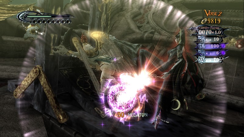 Given how thorough and pointed that part of her character is, it manifests in a lot of the game’s design, Platinum’s trademark style being one of them. While Bayonetta has its own list of influences, ranging from 17th century European religious institutions to campy 1940s pulp media and modern American action movies, the fundamental style isn’t all that different from what would appear in Vanquish a couple of years later. It’s an imaginative, playful, and camp aesthetic where style is substance, celebrating what becomes possible when one is no longer bound by the stultifying confines of reality.