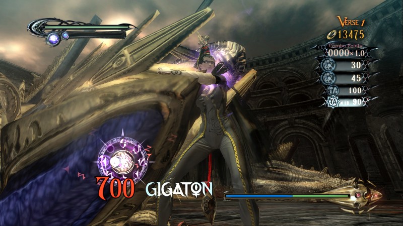 Also consider how the game’s combat system reinforces that character. Truth be told, Platinum never wanders far from the mold they established in Devil May Cry. Most of the differences between it and Bayonetta refine rather than question that mold: exploration is streamlined to put more emphasis on combat, fights against such gigantic, towering boss creatures that they’re basically levels into themselves, set pieces/narrative beats, environmental design, etc.; a greater emphasis on mini-games (a segment that recalls the arcade classic Space Harrier, as you ride a rocket across the sea; a motorcycle sequence that pays homage to Hang-On; and Angel Attack, a post-level bonus round, being prime examples); the ability to equip weapons to both Bayonetta’s legs and arms, allowing for a wide variety of fighting styles. In fact, the only substantial gameplay difference between Bayonetta and Devil May Cry is Witch Time, a combination Bullet Time/score multiplier activated by dodging an enemy’s attack at the last possible moment. It lasts but a few seconds but allows you to get in a few extra hits before the flow of time resumes. Plus, it’s used in a few environmental puzzles.