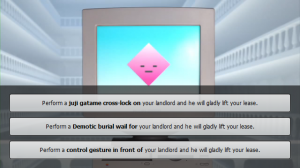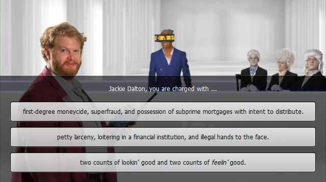 The game itself isn’t as interesting as the ARG that built it up, but it’s extremely entertaining by its own merits. You follow the adventures of Los Angeles regulators Henri and Franco, who have arrived at the bank of Bear Stearns in the Free Trade Zone to find witnesses for a trial going down later in the day against bank head Jackie Dalton, a raving mad billionaire in dirty in the bad mortgage trade. In order to punish the horrid criminals would dare do so much dollarcrime and moneycide, you are given choices at select moments that move the story and effect how things play out within the episode. To date, two episodes are on the site, and an “Impact Zeroth” (each episode is called an Impact) can be found via real life phone call through the old @Horse_ebooks number.