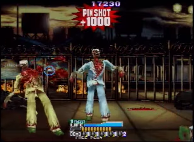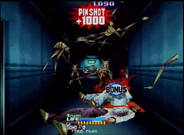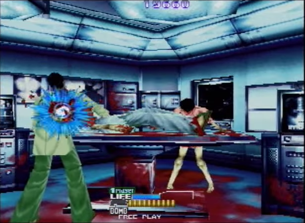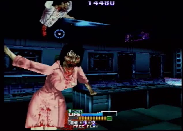There are some slight differences in gameplay: the UZI have been replaced by shotguns, that need to be manually reloaded, another feature taken from Sega’s series. This time it does actually matter where you shoot the humanoid enemies, since not only headshots instantly defeat them, with geysers of blood erupting from their neck stumps (and they thankfully stay dead), but they also give many more points for those who want to go for the high score. The headshots in fact can also be chained for even more points, but the biggest bonus of all is given by the “Perfect Breaks”, obtained by first shooting off a zombie’s arms and then its head. Big scores are also possible thanks to several medals hidden everywhere that do nothing but raise the player’s points. Other items are the usual medikits, bullet power-ups and three tiers of bombs, the last of which is nothing less than a satellite shooting a huge laser beam: perfect for an exaggerated game such as this one, but far less effective than it should be.