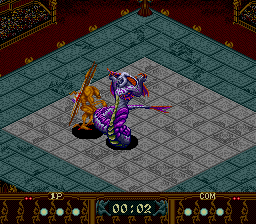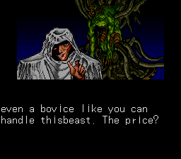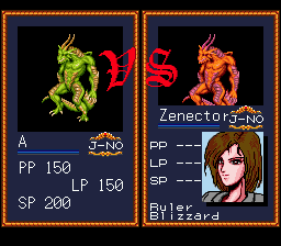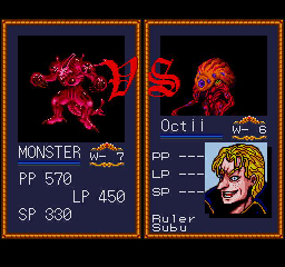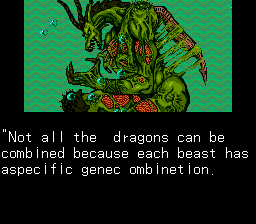 The story in the single player tournament is pretty basic. You want to become the DRAGON WARRIOR, this is the title given to the person with the most powerful beast, so you buy a giant dragon man thing from a mad scientist and go at it. The most important thing about this story is the term “bovice.” It’s a typo, they meant to call you a novice, but it’s the most fun thing in the game. The game refers to each contestant as a Ruler, though each in fact is just another person who grew a huge monster in a vat. The opposing humans that control each beast were designed by someone the game credits only as “Sandman.” Despite the pseudonym, they look no different from what you’d see in a typical Japanese adventure game of the time like Exile. So they had a different person do character portraits that clash greatly with the rest of the game’s style.