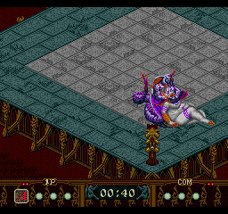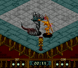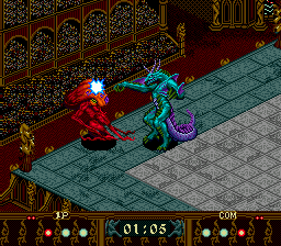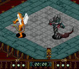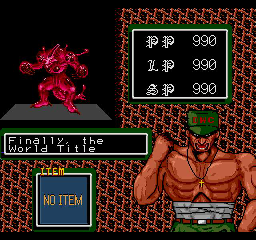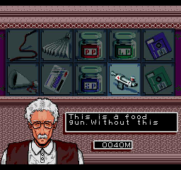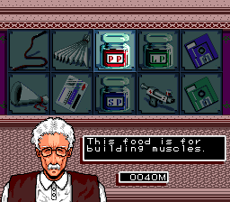 Much like everything else in the game, however, this ends up not being very fun as the computer opponent works by reading your inputs instead of reacting to what’s happening on screen. Also, while the game is viewed from an overhead perspective, the sprites are drawn in profile, meaning you have to move a character “lower” or “higher” on the screen to make sure your attacks connect properly. This makes for a weird disconnect between the sprite design and the actual controls that makes the action look at stupid as possible. It also has the unintended effect of making many of the attacks look highly sexualized. Speaking of which, one of the beasts, Airhohle, attacks by lashing at enemies with its two story tall penis.You can improve your particular beast by buying items to make them stronger or faster, and you can also use a genesplicing device to combine their abilities with that of another beast to get a new unique creature once you’ve beaten them and gotten their combat data. Again, great idea, but you only have two opportunities to do this during the entire tournament, making for a small variety of monsters to use. The worst part of this is that you can’t use your uniquely developed creature while playing against your friends! Instead you can only choose from a set of pre-made ones, which you cannot use in the single player game. The game uses passwords to save up your creature’s abilities and type, and with such a small selection it’s crazy that you can’t have two players put in passwords to use their own creatures at the same time.
