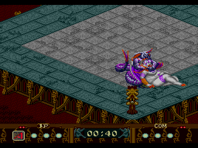 Everything here is slow as molasses. If you get knocked down, you’re not getting back up for a solid six seconds or more, which is forever in terms of a game about giant monsters struggling with each other. The animations for each move are very short but are looped for way too long before a move is completed, so you spend a lot of time watching some of the laziest animation ever play out over and over again rather than actually playing the game. That said, in a lone flash of competence, I do appreciate that the developers use the Fire Pro Wrestling controls for grappling with an opponent. So instead of having to furiously mash a button like in most wrestling games of the time, with the fastest button pusher winning, the game is supposed to reward timing and strategy.