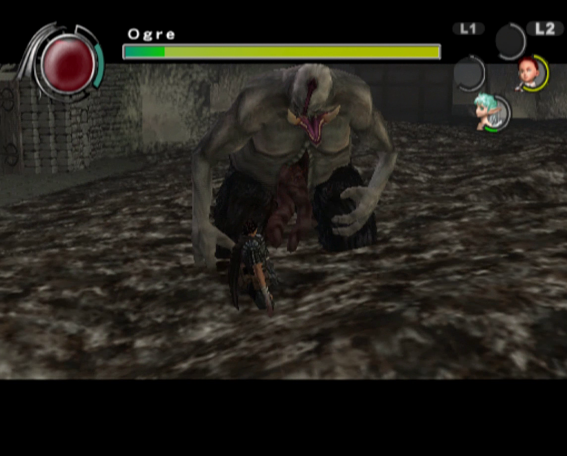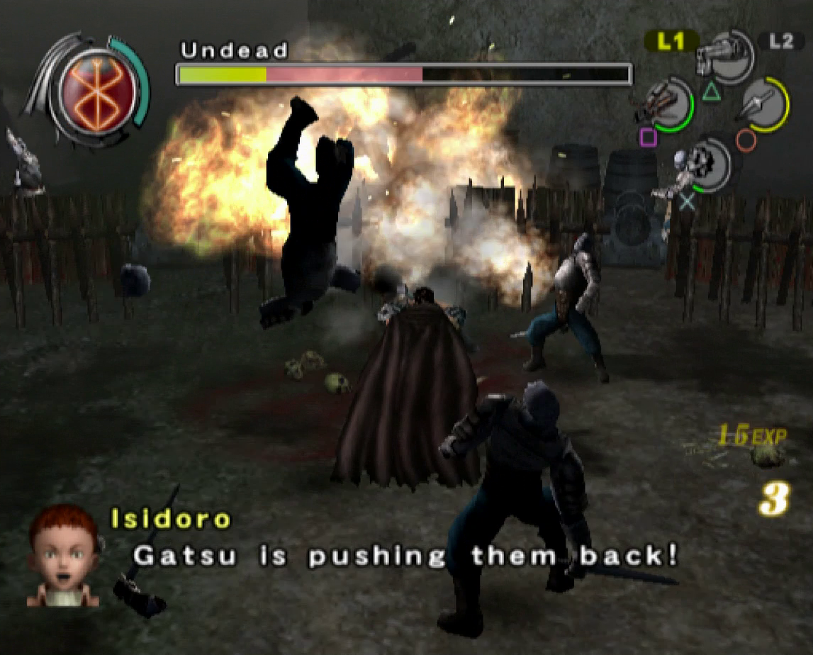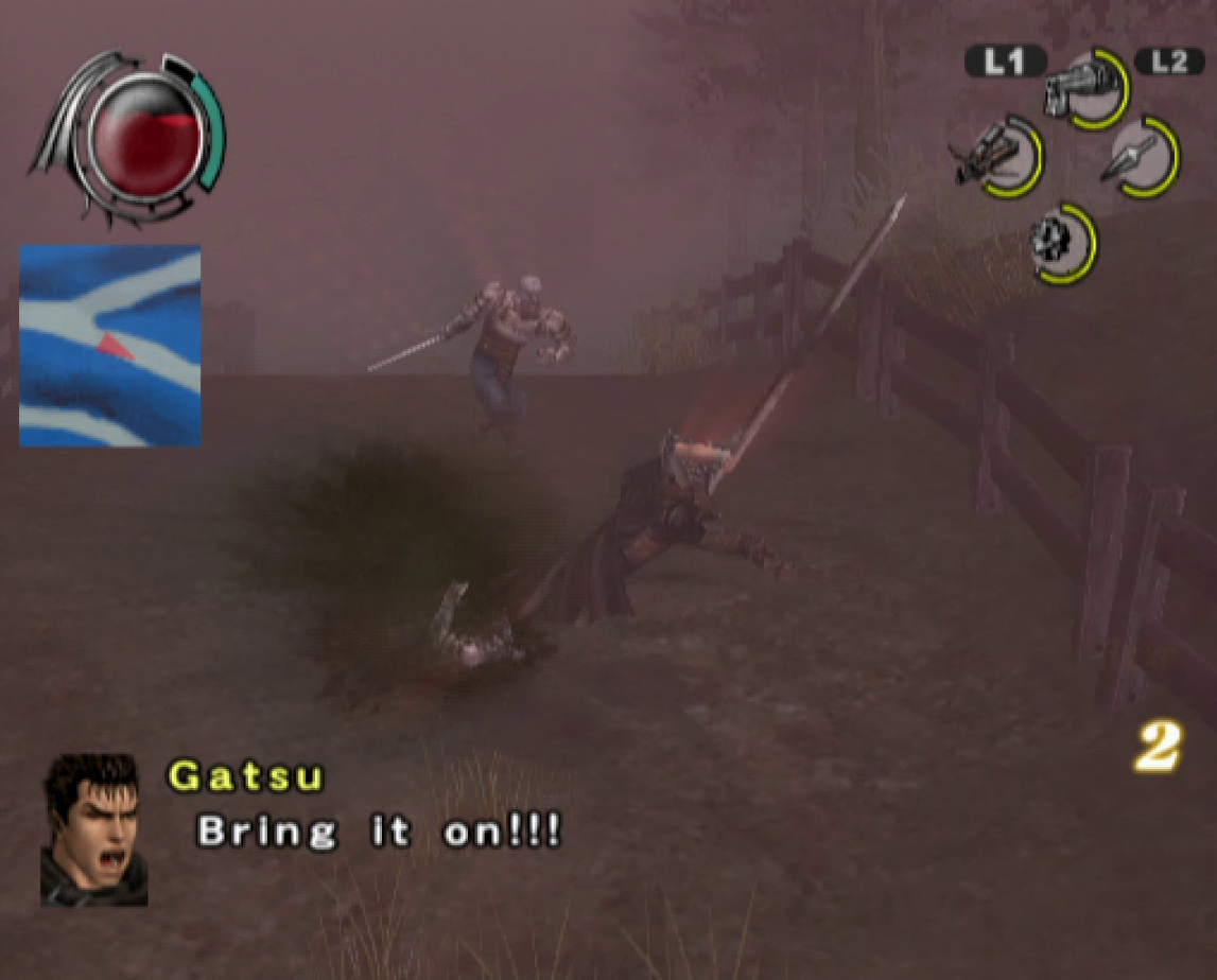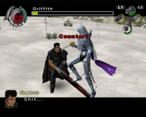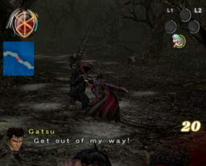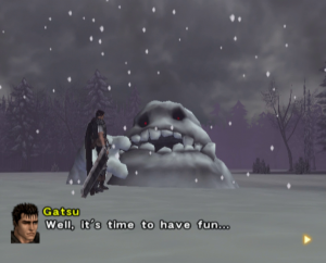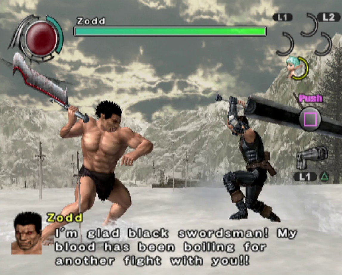 The graphics benefit from the power of the PlayStation 2, offering significantly smoother animations and more detailed character models than the previous game, though the bland color palette and the lack of image sharpness do detract from the presentation. Every line of dialogue is fully voiced, which isn’t entirely for the best, since characters have a bad habit of chiming in with the same few compliments every time Guts lands a finishing move. Susumu Hirusawa returns once again to compose the opening and ending themes of the game, making for two rousing, exceptional songs in an otherwise unremarkable soundtrack.