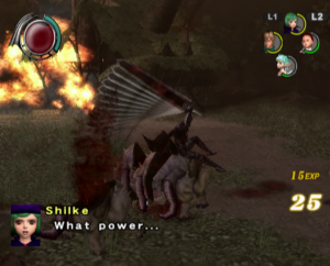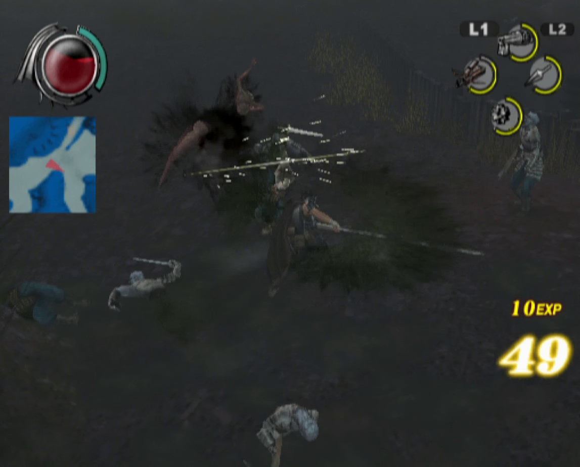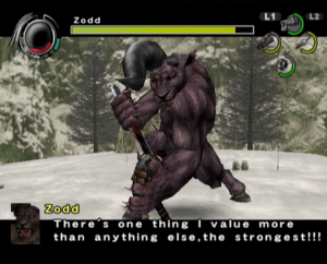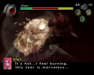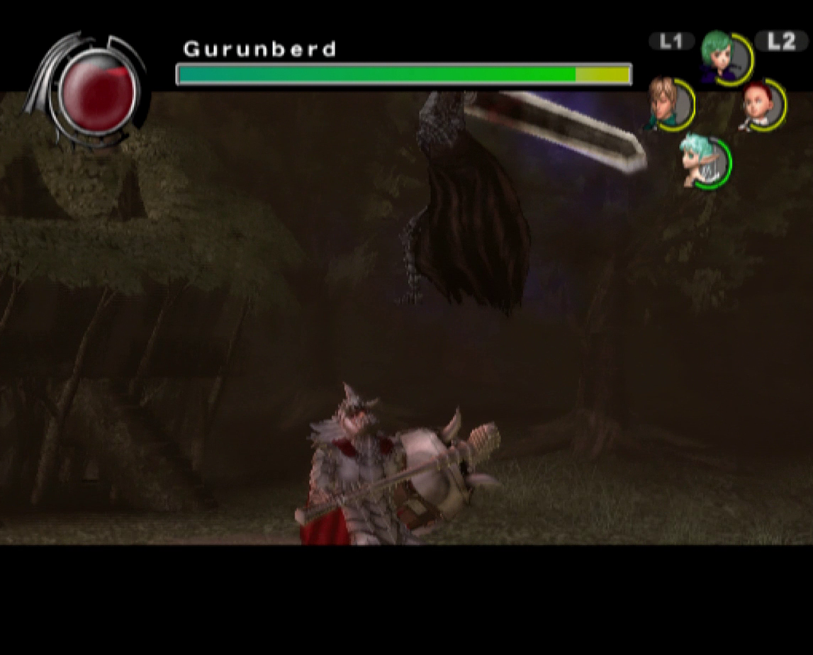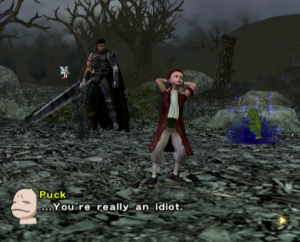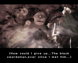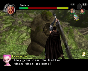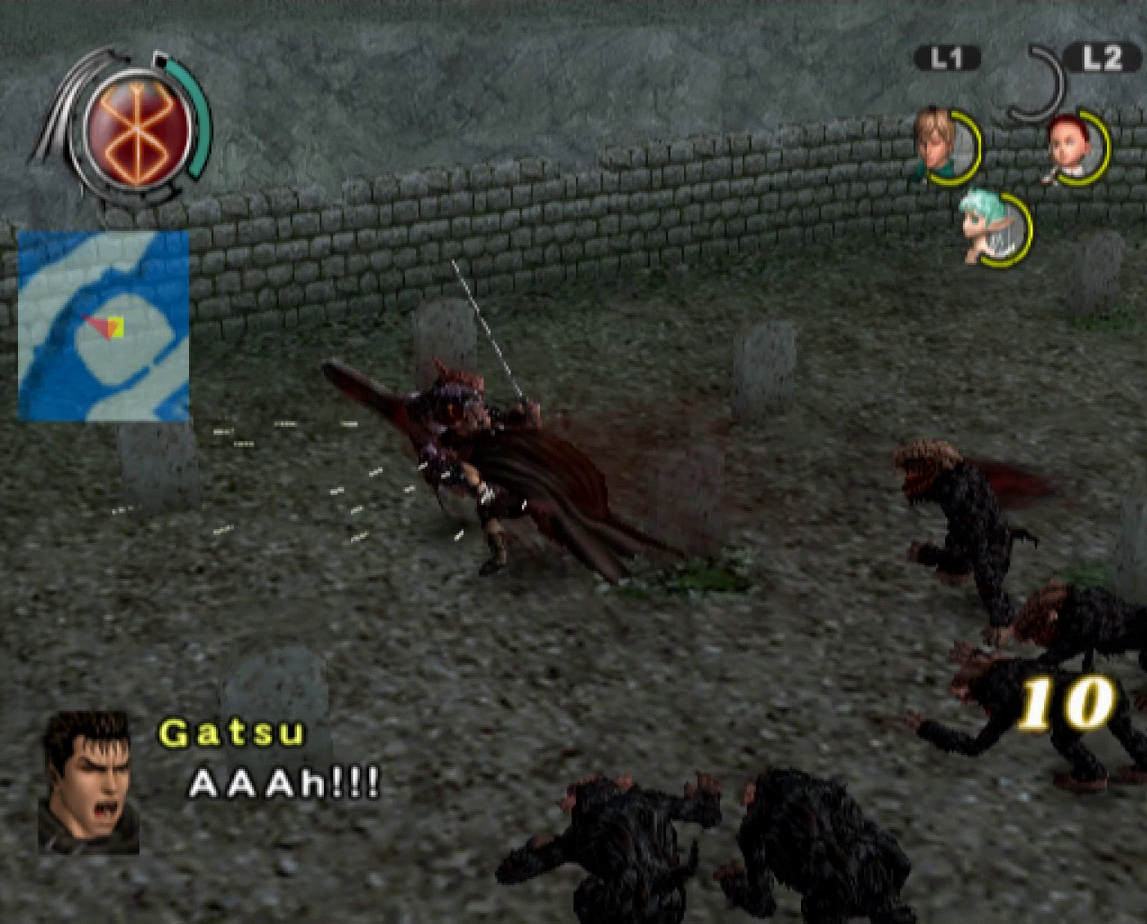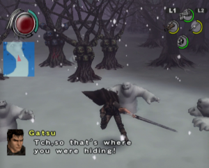 The graphics benefit from the power of the PlayStation 2, offering significantly smoother animations and more detailed character models than the previous game, though the bland color palette and the lack of image sharpness do detract from the presentation. Every line of dialogue is fully voiced, which isn’t entirely for the best, since characters have a bad habit of chiming in with the same few compliments every time Guts lands a finishing move. Susumu Hirusawa returns once again to compose the opening and ending themes of the game, making for two rousing, exceptional songs in an otherwise unremarkable soundtrack.
