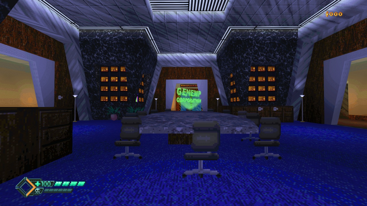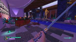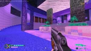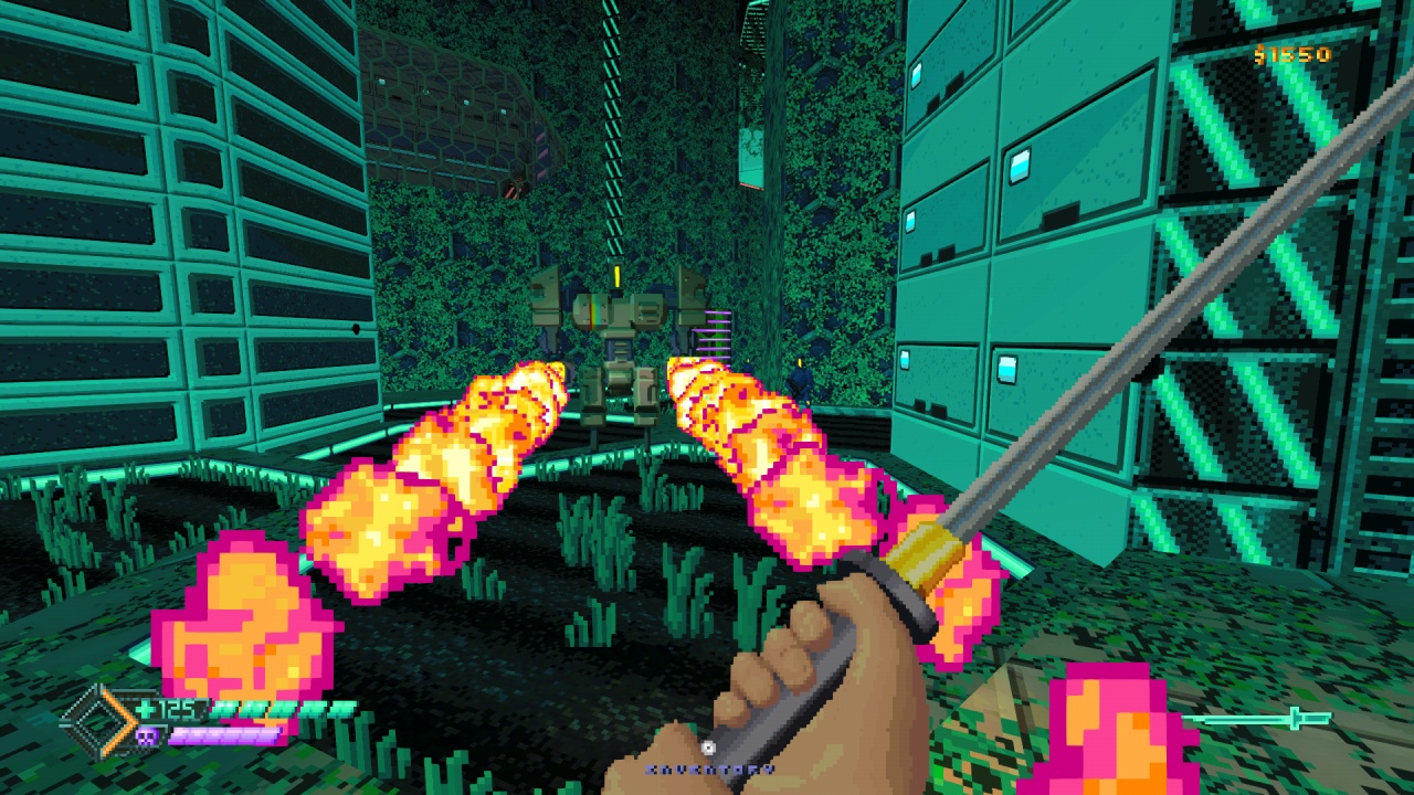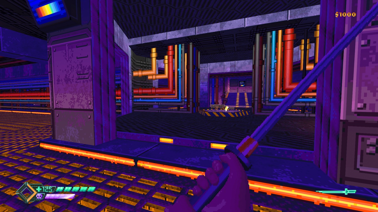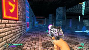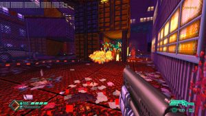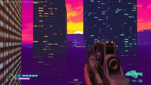 The game consists of five episodes, which each consist of several large, interconnected stages. Some of them, like Sunset City in the second episode, feature an urban district as a central hub, with missions that branch off in different directions. The closest comparison as far as retro shooters is something like Strife. Additionally, killing enemies yields money, which can be used to purchase upgrades at various computers. Some of these increase your maximum health or ammunition, while others expand your abilities, like grabbing items from further distances or allowing you to dash more frequently.