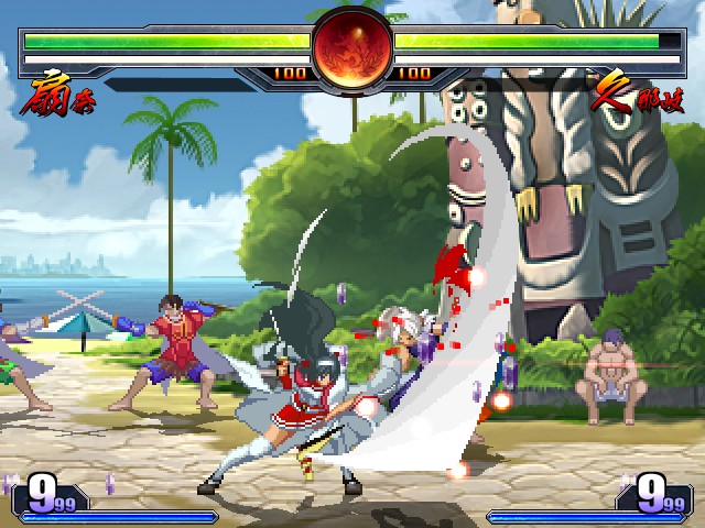 The rest of the graphic quality is mixed. The pre-fight intros are practically straight out of Guilty Gear, complete with brief guitar wailings, and are just as awesome. Like many doujin games, the backgrounds tend to be a bit on the dull and empty side, though there are a few with some life to them, particularly the Hawaii stage. The music is all supplied by doujin rock group MintJam, most of which consists of some excellent fast paced rock. The final battle features some hilarious Engrish singing, which makes it completely worthwhile to play through the single player mode.