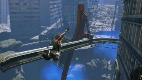 The scenery is fantastic. Ascension City looks the part of a New York-style skyscraper graveyard with crumbled buildings, scorched earth, broken highways, and corporate billboards to boot. You see all sorts of ads for Pepsi, Nvidia, and other logos for various wares, which is a bit annoying and cheapens the game’s validity. The background music is just about what you would expect for a game of this scale; a fine mix of orchestral and electronic sounds that comes off as dramatic and adds a lot to the overall atmosphere. When it comes time to kick ass, the volume inflates and the tempo flares up to match the action. If you keep an ear out, you will even hear several remixes of old Bionic Commando music that are done beautifully.