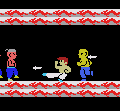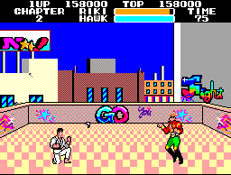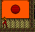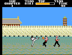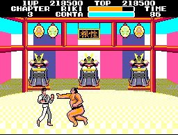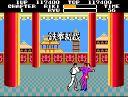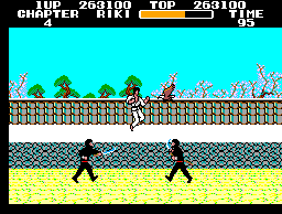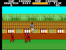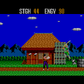 The third stage is kinda cool – in Hokuto no Ken it’s just a palette swap of the first stage (it’s called Devil Rebirth), but it has whole new graphics in Black Belt, and takes place in on a Japanese farm. The tiny little guys in the red outfits have sorta funny looking heads.