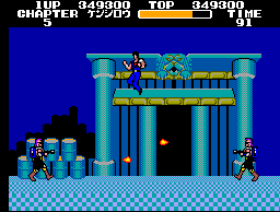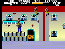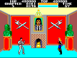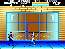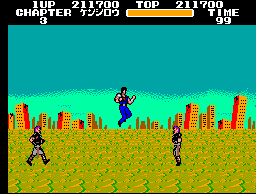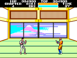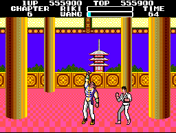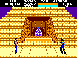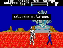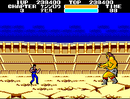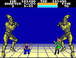 This boss is really strange in both versions. The only way to beat him is by exchanging blows until he dies. In Black Belt, he simply disappears into thin air, leaving only his mask on the ground. It’s pretty creepy! In Hokuto no Ken, Kenshiro faces off against Toki after he’s been rescued. After the fight, Toki simply walks away and says something before you continue to the next stage. (This fight doesn’t happen in the manga – it could be surprised that this was a misplaced battle against the fake Toki, but that was before the Cassandra Level chapter.)