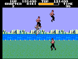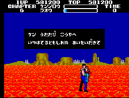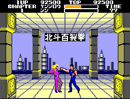 Functionally, it’s little more than a rip-off of Irem’s Kung Fu Master (AKA Spartan X), it controls much better. You walk from left to right, punching, kicking, and jump kicking bad guys. Every once in awhile, the screen will stop scrolling for you to pummel a mini-boss, before allowing to proceed. The levels are much more varied than the repetitive palace of Kung Fu Master. In fact, it has some really fantastic visuals, with some extremely impressive parallax scrolling backgrounds. Plus, whenever Kenshiro hits an enemy, they shatter across the screen. Not exactly the blood and gore of the manga, but close enough.