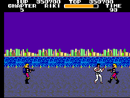 Despite the extra moves, the controls themselves are much slower than the original version. The stages are rarely more than a few screens long, and you simply walk back and forth killing bad guys until the game is sick of throwing them at you. There are one-on-one boss duels, but while the original version required some interesting tricks to beat your foes, these are fair sloppier. Later in the game, you get to play as Rei and Toki, but they control mostly the same, just with less special moves. The graphics are surprisingly decent considering the quality of other early Sega Ages titles, as they utilize a cel shading technique that makes it look similar to the manga, but you literally fight variations of the same enemy over and over. Unfortunately, there’s also a surprisingly lack of violence. Hokuto no Ken is known for exploding heads and bursting intestines, but other than some small blood splatters, there are very few cool death animations. So really, the only good thing about this package is that it includes an emulated version of the original Mark III release.