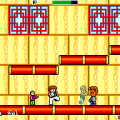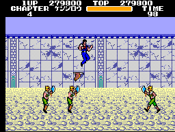 The fourth stage in Hokuto no Ken is the Legend of Cassandra. The midbosses are the the whip wielding Wiegel and those two turban clad guys with swords. In Black Belt, the level was changed to a Japanese garden, and the axe wielding warriors were changed into ninjas.