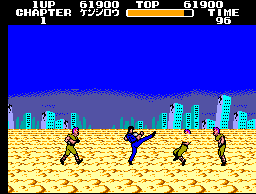The manga was unheard of in the States during the mid-80s, so Sega decided to change around all of the graphics, and rename it Black Belt. In this version, the player controls a karate master wearing a gi, fighting in modern-day Asian landscapes to fight evil and rescue your girl. In Hokuto no Ken, the player controls Kenshiro, fighting through post apocalyptic wastelands and beating up characters from the manga. Some (but not all) of the music is different. The only major change is that Black Belt gives you health restoration power-ups (usually in the form of sushi flying through the air) while Hokuto no Ken gives you almost none. Strangely, the invincibility power-up in Hokuto no Ken is a letter “P”, while it’s the Japanese symbol for “strength” in Black Belt. Here’s a level-by-level gallery detailing the changes. It’s especially to cool to see how they changed the iconic Fist of the North Star characters into regular schmucks.