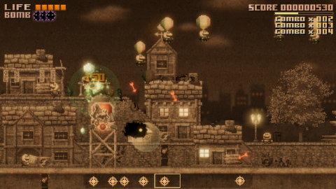 Beyond the mechanics, this is just a gleefully weird looking and sounding title. The style is something out of early 20th century Europe, displayed mostly in dark or sepia tones, constructed entirely out of pixels. Most of the enemies are mustachioed little men that look awfully like the hero from Onion Games’ previous title Dandy Dungeon. They fly around on balloons and such; you almost feel bad killing them (though to be fair, they are trying to murder you first). The art was provided by Kazuyuki Kurashima, who has worked with Kimura on several of his older titles. The soundtrack primarily consists of a choir singing in a nonsense language, setting the whole experience somewhere between “goofy” and “unsettling”. The boss fights are typically baffling, as they typically shatter after taking enough damage, revealing a pilot. Within the comical blimp of the first stage is a rotund, floating man that looks like Santa Claus. The third boss, a gigantic wheel that shoots electricity, is powered by a mouse on a wheel. There’s no dialogue or narration in the game itself, so much of the story, what there is, is left to your imagination.