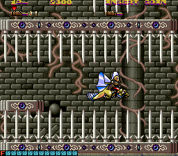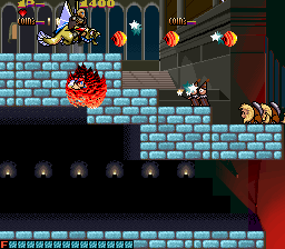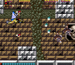 There are eight levels, the first one taking place in a forest, outside the villain’s castle with all the others being inside it. While the background graphics are mostly stone corridors and trap filled dungeons, every so often you see something weird and out of place. A great example is the giant bird in level three. The creature pokes his head out of a dark hallway periodically through the level for seemingly no reason other than to be a distraction. Another one of these strange sights is the giant fish that hides behind trees in level one.