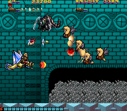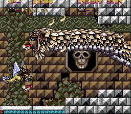 Black Heart is quite dark. You play as a knight riding on a dragon off to save a girl from an evil wizard. Between levels, you can see the girl chained up and being beaten within an inch of her life, much like some of the intermissions in Konami’s XEXEX and Namco’s Phelios. (Something of a vaguely disturbing trend, then.) On top of that, in the last level, when you finally get to save her, the evil wizard kills her right in front of you. The ending does not make things much better, as the world is still in ruins and the girl is still dead. Some moments can seem pretty chilling, especially in the final battle, where the girl you’re trying to rescue is killed. Unlike every other death in this game, her body stays there, and never explodes or fades away.