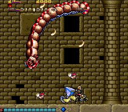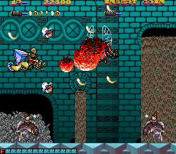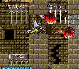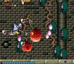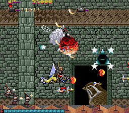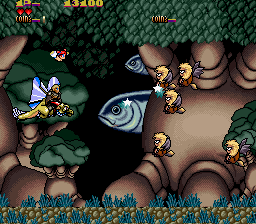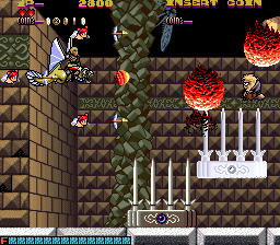 The enemy designs are also quite varied. Some of them are silly looking, like the whimsical flying monkeys or the stick figure magicians riding on fishes that flop around outside of water. Others are quite disturbing, such as the recurring mini-boss, which is a creepy looking eye inside a star, or the demonic fly enemy that will aggressively assault you, and is one of the only enemies that won’t go down in one shot. The bosses follow a similar pattern, the first one obviously being the weirdest, as it’s a giant that rides on a fish that’is eating an elephant while being carried by minotaur. The second level contrasts this, as its boss is a long, feathered snake that has a monstrous face and is easily one of the creepiest monsters in the game.