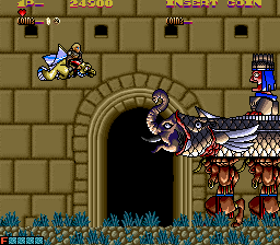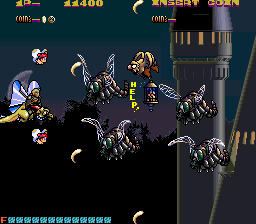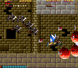 As mentioned before, you play as a dragon-riding knight. While your sprite is huge, you only die if the knight is hit, a progressive idea for the time, before the microscopic hitboxes of modern bullet hell style shmups. Your dragon mount has two attacks, a small fireball that acts as your main weapon, and a special, destructive fire breath. The fire breath is fairly short range, making it risky to use. It also takes up an energy meter that’s replenished by saving caged blue fairies. This attack is only really useful against bosses, as most enemies go down in one shot anyway.