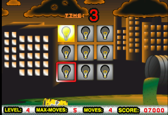In Black Out!, players must turn off all light bulbs presented in a 3×3 grid by performing the lowest amount of moves possible to win the round and proceed to the next round. Each round has a pre-set light bulb pattern and it’s up to you in figuring out the correct pattern to do so before the timer runs out and the game is over, Although there are continues to keep playing, these are also limited depending on the difficulty setting. Said difficulty setting also alters the number of moves players can do during rounds and time limit so, be prepared and get both a notebook and a pencil near you to write down each pattern, as failing to complete a round will send you to the very first round on the current stage. Be warned though, as the game will mock you by attempting to pause it.