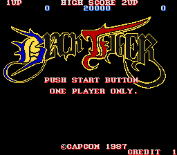Capcom’s Black Tiger is one of the many dark fantasy barbarian-themed arcade games of the mid/late 80s, undoubtedly inspired by the Conan the Barbarian movie and the many fantasy movies that were in vogue at the time. You control the eponymous Black Tiger, a muscular warrior of tremendous strength, as he treks through eight levels and defeats the three dragons that have been pestering the kingdom. Oddly, the game is called Black Dragon in Japan, shifting the title to the main enemy rather than hero, though it’s unclear why – maybe “tiger” just sounded more distinct? It did have the benefit of having a similar title to Capcom’s Tiger Road, another action game released the same year, though that has more of a martial arts theme.