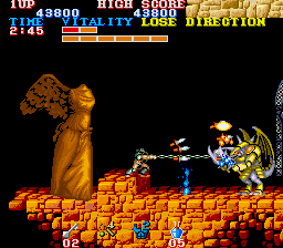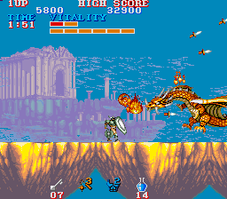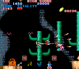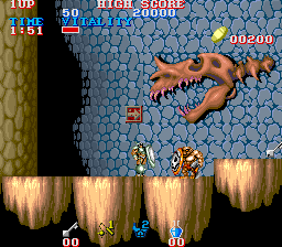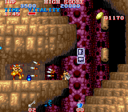 In the late 80s, role-playing games were all the rage in Japan thanks to the popularity of Dragon Quest, and so some arcade games tried to blend these elements into them. In Black Tiger‘s case, this means collecting money from fallen enemies, as well as treasure chests and breakable jars. This marks the first appearance of the “zenny” currency, reused in many later Capcom games, including Forgotten Worlds, Breath of Fire, and Mega Man Legends. The word itself is derived from “zeni“, an old Japanese term for money. Among the other items you can find are POW icons, imported from various Capcom shooters, which will destroy everything on the screen.
