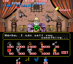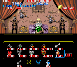 Throughout each land are statues, which are really men that have been encased in stone. Some are generous enough to grant you free items, others give mostly useless tips, and a few give even more useless “thank you”s. Every once in awhile, you’ll find one that will set up shop, allowing you to purchase a variety of items. One of the most important among these are improved weapons, which enhance the power of your flail. Once obtained, it will never go away, even if you continue, so it’s yours as long as you keep pumping quarters into it. There’s no benefit to upgrading each and every weapon, so prudent gamers may just opt to keep the weakest one while saving up for the strong (flame) whip, and then never have to worry about upgrading them again. At this point, you can just spend all of your money on better defensive equipment. The enhanced armors are not permanent, though, and degrade when taking hits. So these are more useful in cases where you need to be able to weather a lot of damage, particularly for boss fights. The shopkeeper’s goods are rounded out by keys, used to open treasure chests, and potions, which are automatically used if you’re inflicted with a status element by an enemy (“poison” will stop you from throwing daggers, while “lose direction” will reverse your controls).
