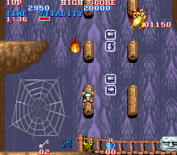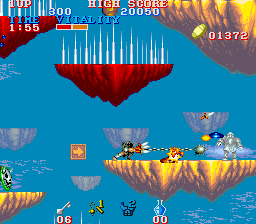 There are direct paths through the levels (indicated by arrow signs), and they sprawl in all directions, with columns and vines you can climb up to reach greater heights. There are many branching routes and sidepaths though, including special rooms called “dungeons”. These have plenty of extra power-ups, providing you can make it out alive, because if you die, you’re kicked out and cannot re-enter. Hidden items can also be found by destroying certain walls. Most items will be familiar to Capcom fans, including the bamboo shoots seen in SonSon, the screen-clearing POW icons, and the windmill Yashichi icon.