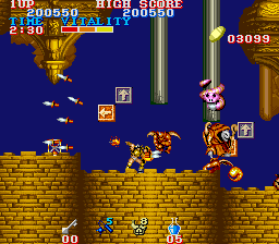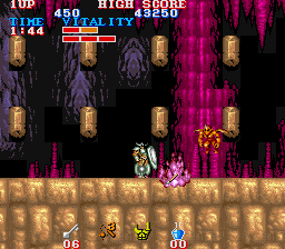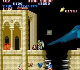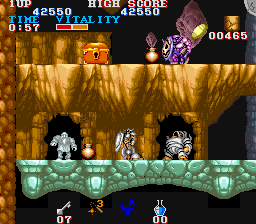 Black Tiger never received a direct contemporary console ports, but it was drastically reworked into SonSon II for the PC Engine, which keeps the same basic gameplay put sticks into a Far East-inspired world based on the Monkey King legend, starring Son Son from the early 80s arcade Capcom game of the same name. The arcade/SNES game Magic Sword is sort of a spiritual successor to this game, in that it keeps the fantasy and RPG elements, but ditches the exploration and tones down the platformer to turn it into a more straightforward brawler. That in turn paved the way for Capcom’s Dungeons and Dragons beat-em-up series published in the early 90s.