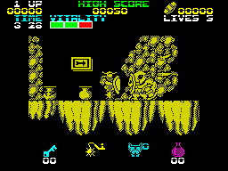 The Commodore 64 version has an ugly color palette, and there simply aren’t any backgrounds, so it looks really dark. The action is a little too fast, too, so it doesn’t feel quite right. Some of the levels have been cut and what are present are scaled back and changed from the arcade game (the spinning skulls appear right in the first stage, for example). The main theme has been replaced by some generic, repetitive piece of music, while the real arcade theme is strangely only used in the dungeon segments. It’s not a great port, but it’s better than the others.