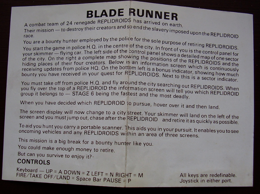 Blade Runner’s brief manual spells out the amusing differences between the game and the movie. Due to rights issues, Replicants become Replidroids. Even more egregious, players do not control a Blade Runner, they control a Bounty Hunter. Other terms from the movie seem fair game. You retire your targets and you fly around the city in your spinner. To win the game you need to destroy a whopping 24 Replidroids; the movie had a trifling 6.