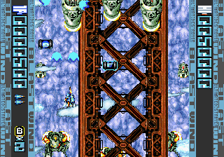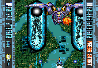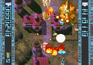 That variety is sorely missing from the weapons system. As mentioned before, the player’s offensive options are unnaturally restricted for a Technosoft game. Each ship has just two fire modes. There are no weapon pods, although there is an orb-like shield item that can absorb a few enemy bullets before it disintegrates and leaves behind a power-up. The shield’s area of effect is large, and positioning can be controlled by careful maneuvering. Blast Wind also includes rudimentary bombs, but the most unique offensive option is the actually weapon power-up item itself. Every time the player picks one up – even if the weapon isn’t at full power – bolts of lightning erupt from the ship’s nose and sides. This lightning damages enemies and grants the player temporary invincibility. The mechanic is easy to abuse since each level has a dozen or more power-ups, but waiting until the last moment to grab a power-up and then swooping up the entire screen never gets old.