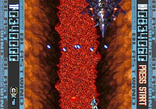 For others, though, Blast Wind‘s “switch” mechanic might be just the shot in the arm needed to delay the inevitable. Each stage features one or more switches that activate on contact. Switches can release powerups or trigger events such as shrinking the player’s ship, but usually they change the stage path. When a route switch is flipped, the screen shifts and play continues on a new rail. The mechanic is often advertised as Blast Wind‘s primary selling point, but it more than a gimmick? Yes and no. To a casual player looking for an easy 1CC, choosing route variants isn’t that exciting. Unlike in Darius Gaiden, which provided alternate routes that led to exclusive stages and wholly new environments, you’ll always end up in the same place in Blast Wind. Alternate routes don’t offer radical changes or bold new sights – just remixed enemy waves, different powerups, and sometimes altered boss patterns.