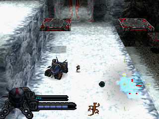 Unlike in previous Blaster Master games, you tank starts with only one side weapon, and others are activated a little later in the game. The side weapons can be upgraded to increase their capacity and power. Your tank (and Roddy also) has a new strafing dash jump that is useful for dodging enemy fire, activated by using the shoulder buttons. Roddy still has the upgradeable gun, but instead of a grenade launcher, he has a napalm attack that acts like a bomb and creates mini explosions around the area the napalm was planted. In addition, by pressing the appropriate button, Roddy can activate Hypersonic mode, which has him temporarily zoom around the dungeon room at high speeds, destroying everything in his path. Use of the Hypersonic is limited by a meter that must be recharged after each time it is enabled.