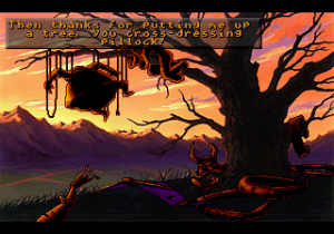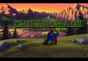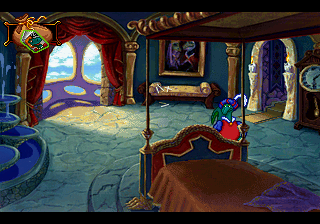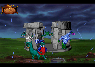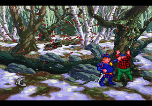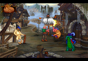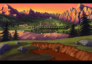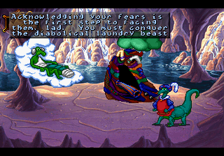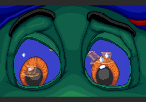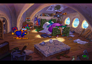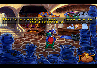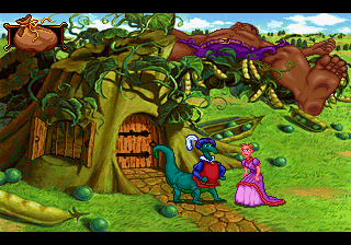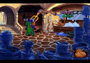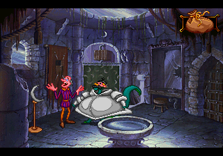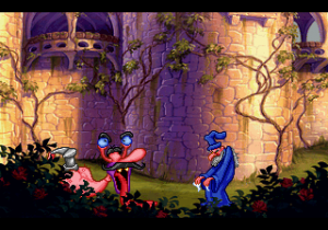 Beyond the dimwitted Knights of the Square Table, the kingdom of Camelhot is home to a variety of bizarre and silly folks. Outside of the Home of the Grimly Insane, a clinic for psychotic storybook characters, you run into a balding Rapunzel who sufferers from Chaetophobia, otherwise known as a crippling fear of hair. She shrieks, claws at her head, and goes absolutely bonkers when you use some hair tonic on her. Inside the asylum you’ll meet a Pied Piper who plays endlessly due to a compulsive fear of rats, and a confused frog that has mistakenly been transformed into a prince. Recurring foes include redneck hunters, one of whom manages to capture the Lady of the Lake, mistaking her for a mere fish. There are plenty of good jokes, a few double entendres, and some amusing self referential humor. During the ending credits, Trivet the Jester is backstage yelling at his agent for putting him in this terrible game, and how Flicker appeared in more scenes than he did. It is quite odd, given that Trivet is featured on the cover despite not at all being the main character of the game.