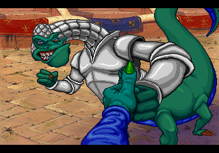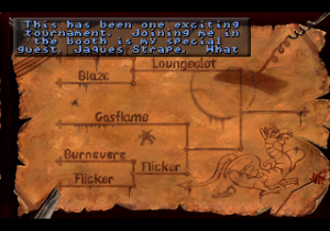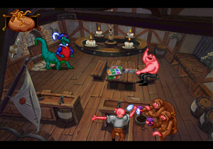 Most of Blazing Dragons’ puzzles take advantage of Flicker’s skill as an inventor and require assembling multi-part machines out of random items. This is usually frustrating in adventure games, but Flicker’s already invented everything you need and has it all handily drawn out in his notebook. All you need to do is find bits of equipment and you’re set. The first puzzle has you creating an automatic dishwasher with the help of a boiling tea kettle, a candle holder, a knitted tail warmer and a mop. The rest are quite easy, and the manual even gives explicit hints on how to solve pretty much everything. There are also a handful of crazy minigames. In the Cat-a-Pult minigame, you launch – what else? – a cat at a variety of targets. It’s particularly silly because instead of firing multiple cats, you simply fire the same cat over and over, who faithfully runs back to you despite being smashed repeatedly into the scenery. Another vaguely rhythm based game is a dancing contest against an Arnold Schwarzenegger look (and sound)-a-like. The most aggravating is the thumb wrestling game, which amounts to barely more than button mashing. Overall, these aren’t terrible, but they could’ve been ditched and not been missed.