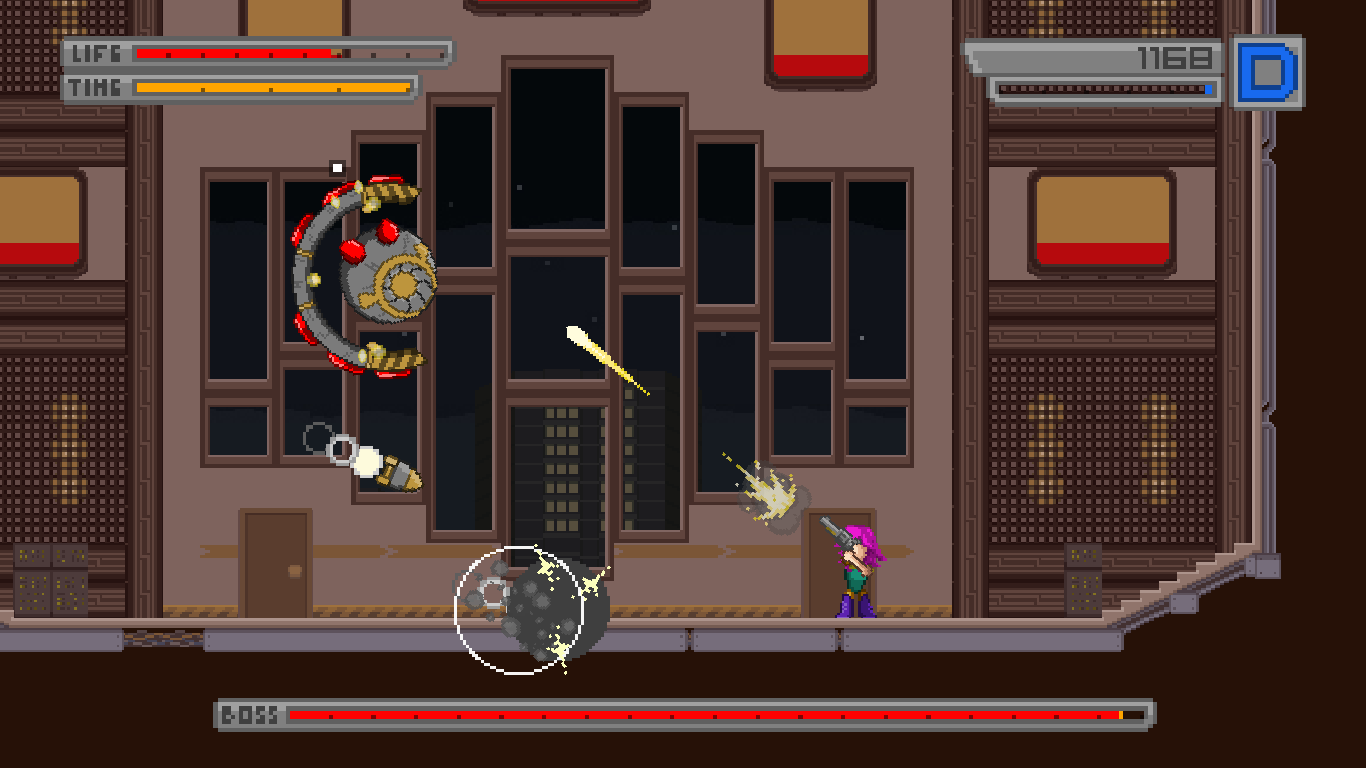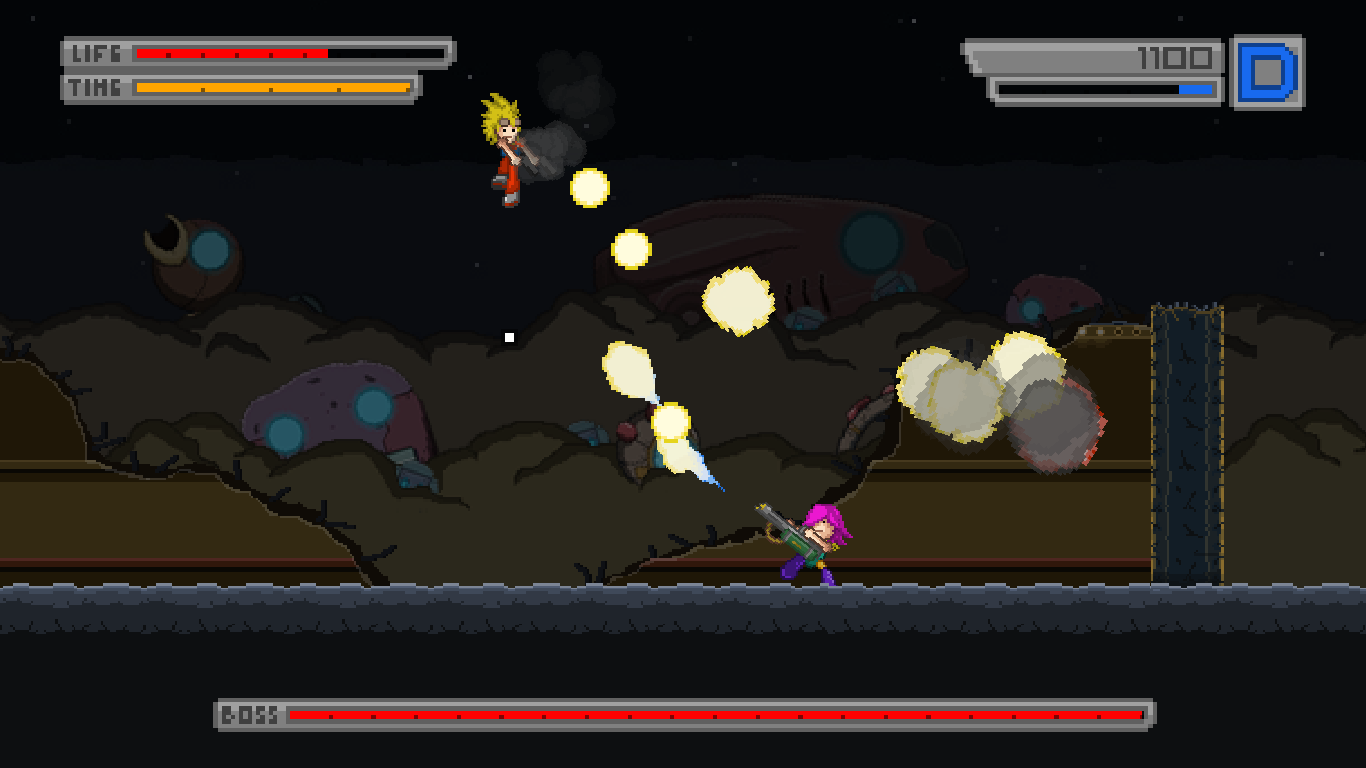 With gamepad or controller, you can flick a stick to shoot in any direction, while you use a mouse if you’re using a keyboard set-up. Your character will fire their weapon in whatever direction you want, no matter their position, even while moving. You can also dash in the air with a special move, wall jump, and slow down time itself to get a better shot at dodging coming attacks or hitting the enemy before it can make its next move. Slo-mo also becomes important in little segments of levels that need you to avoid special obstacles, like the warning lasers in the Robot’s base. It gives a bit more variety to an otherwise simple mechanic, and if you want to even have a chance at surviving harder difficulties, you must absolutely learn to use that slo-mo power properly. It is a survival necessity.