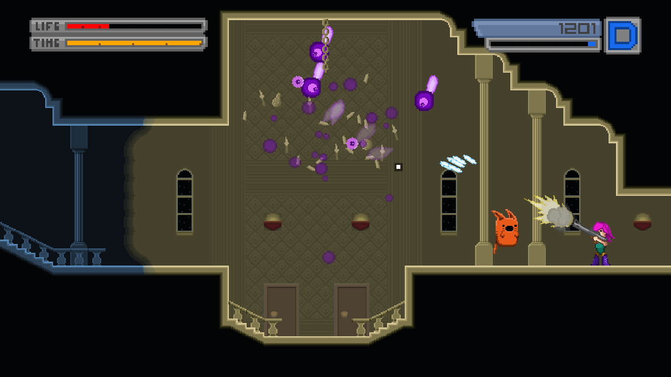 It presents a minimal story that isn’t really a story until the last level. The world has six heroes in the form of giant monsters and robots, and a young girl named Wryn wants to be the newest and greatest hero. So, she decides to go kill all the other heroes because violence is usually the quickest solution to any problem. In a twist, though, a guy only seen at the intro cutscene steals all the glory, leading to Wryn having to take him down on worldwide live broadcast at the hall of heroes. There’s a hilarious sense of black comedy here, with all sorts of hints that you’re actually playing a villain, or that the entire hero system is designed around making violent spectacle of monsters and glory seeking jerks. I mean, you are out to kill the world’s greatest heroes to become the greatest of them all, so maybe there’s a flaw in how these people view what heroes are. Outside those very few story bits, we get informed to Wryn’s personality through the quips she gives at the game over screen, usually breaking the fourth wall a little, and outright demolishing it when you beat the story mode to thank you.